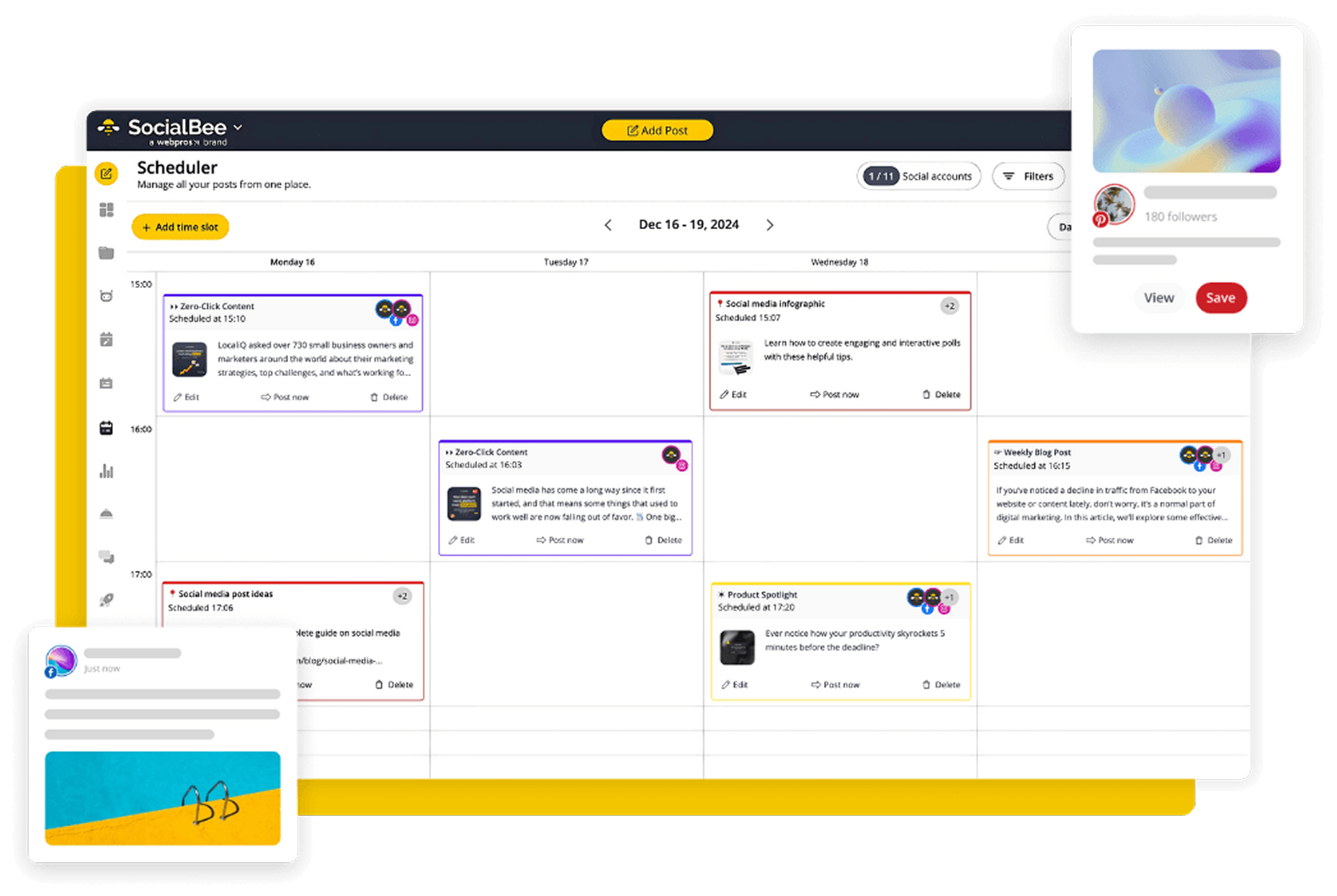 SocialBee makes it easier by letting you create and schedule posts in advance, so your accounts stay active even when you’re busy or taking a break. It handles posting for you, saving you the stress of manual posting, and offers AI tools to help you create content in no time.